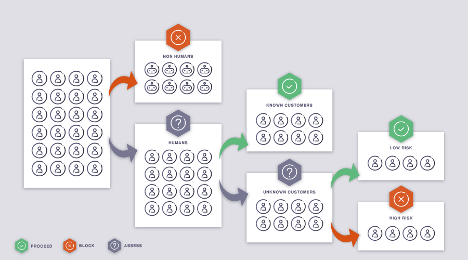 This is especially helpful for e-commerce retailers as their platforms (along with retail banks and popular gaming sites) usually experience frequent user interactions where such data can be compiled and compared. Each interaction can be questioned with “Is this a human or a machine?” and then “Is this a known or unknown behaviour of the customer?” allowing for a segmentation for known (low-risk) and unknown (moderate-risk) users. In fact, 98% of human customers are indeed legitimate and should be trusted.